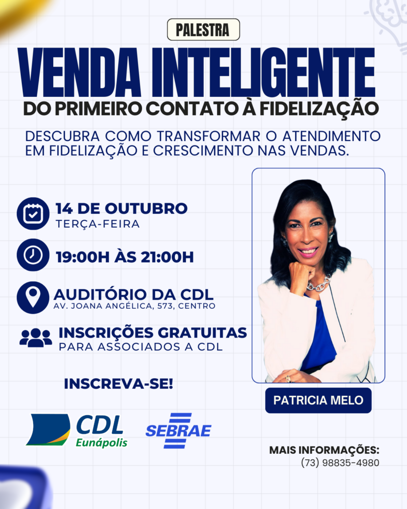 A CDL Eunápolis, em parceria com o Sebrae, realizará no próximo dia 14 de outubro (terça-feira) a palestra “Venda Inteligente: do primeiro contato à fidelização”, um evento voltado a empresários, gestores, vendedores e profissionais que desejam aprimorar suas estratégias de atendimento e aumentar os resultados em vendas. A palestra acontecerá das 19h às 21h, no […]