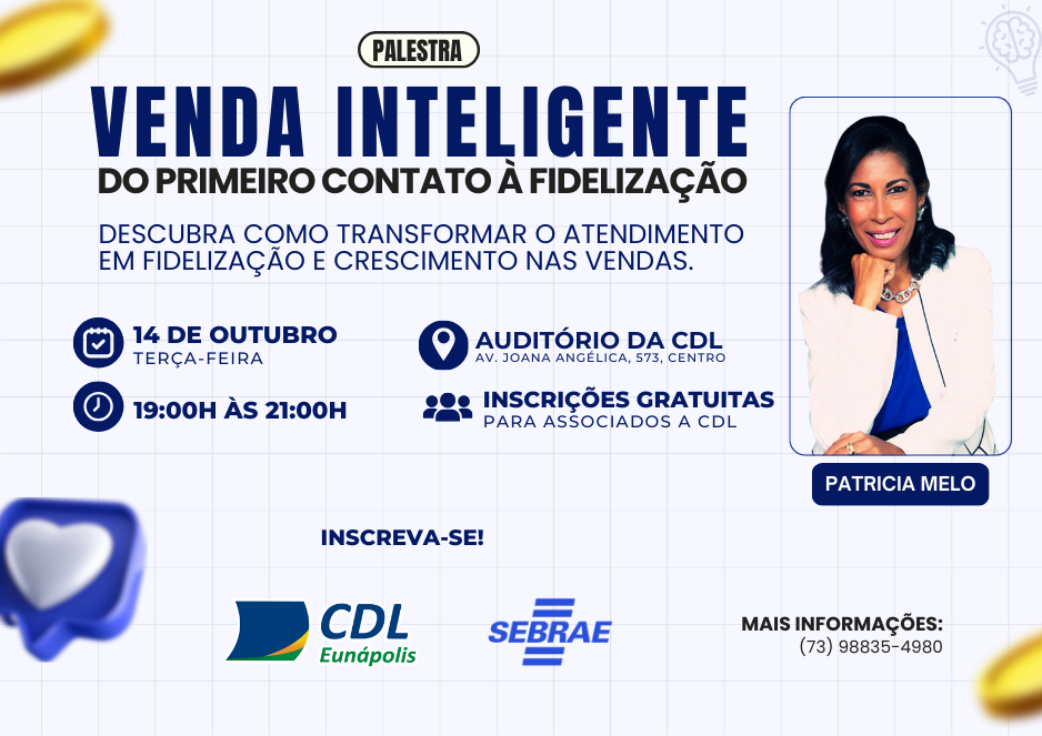 A CDL Eunápolis, em parceria com o Sebrae, realizará no próximo dia 14 de outubro (terça-feira) a palestra “Venda Inteligente: do primeiro contato à fidelização”, um evento voltado a empresários, gestores, vendedores e profissionais que desejam aprimorar suas estratégias de atendimento e aumentar os resultados em vendas.