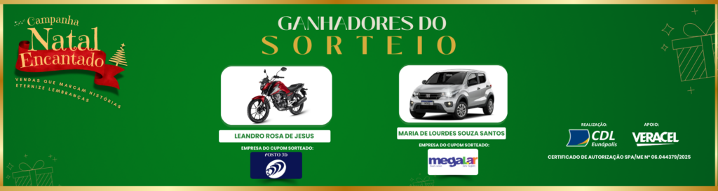 A CDL Eunápolis informa que o sorteio da campanha foi realizado no dia 08 de janeiro, às 18h30, em frente à sede da CDL Eunápolis, de forma pública e transparente.