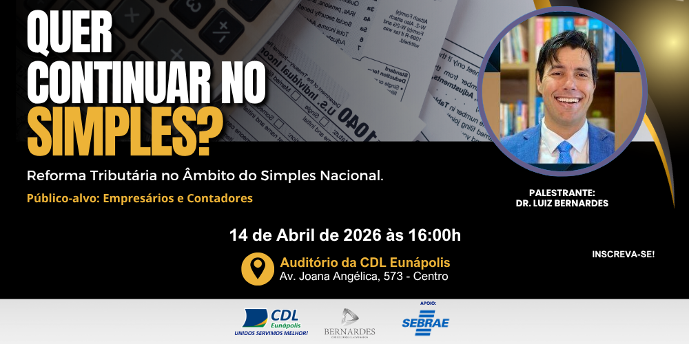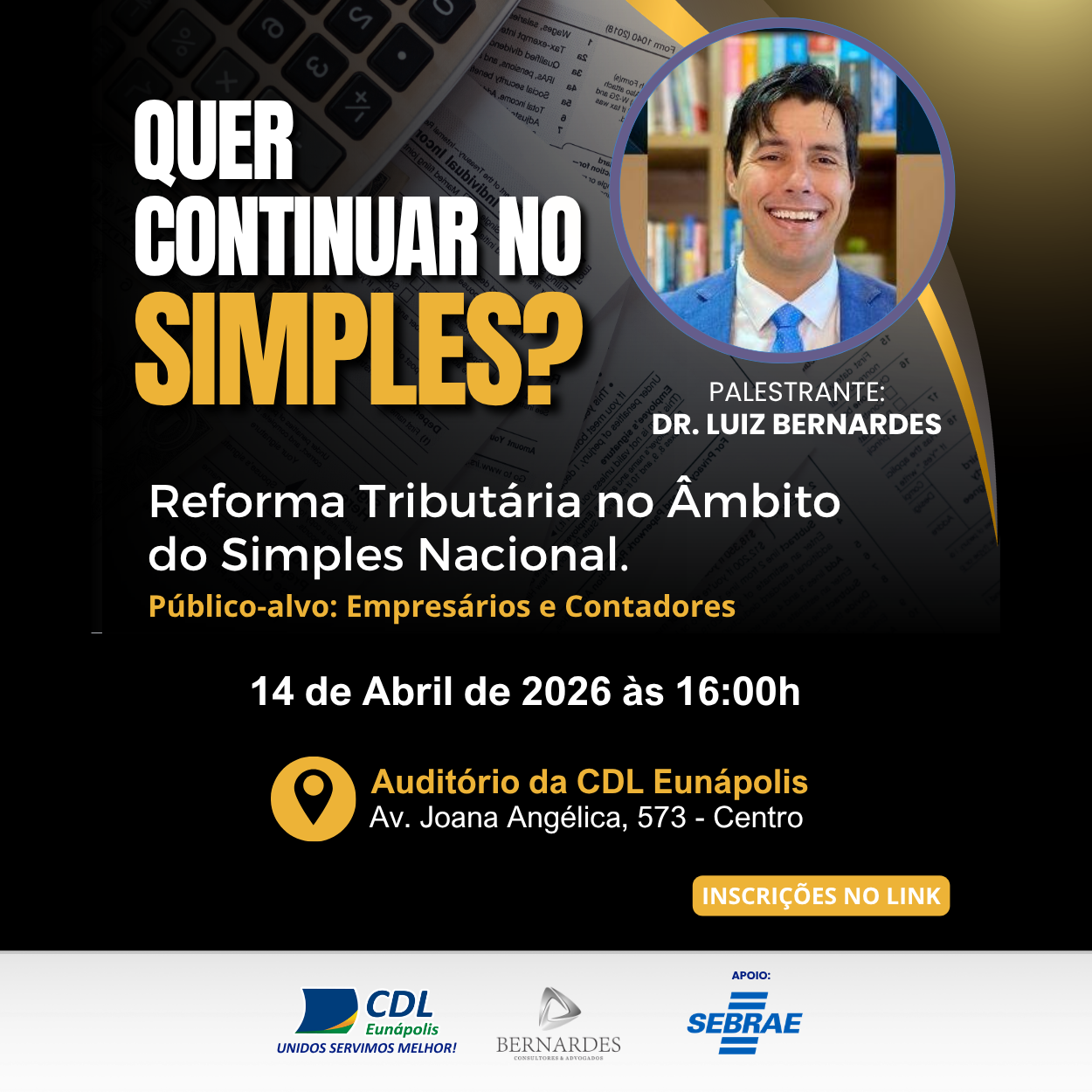 A palestra será realizada no dia 14/04/2026, às 16h, no Auditório da CDL Eunápolis.